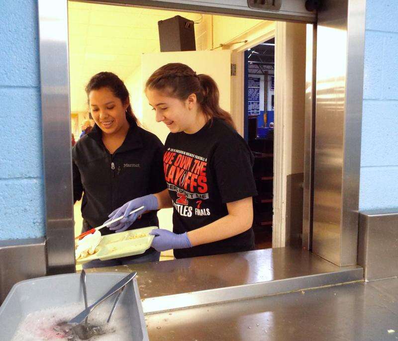 Vianey Sanchez (left) and Maddie Cornett, members of the Sacred Heart Youth Program, bus tables together because, 'Many hands make light work.' Photo by Chanda Green