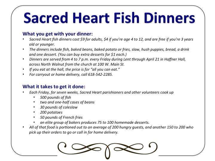 <span style="font-size: small;"><span style="font-size: 10pt;"><span class="contextualExtensionHighlight ms-font-color-themePrimary ms-border-color-themePrimary ident_2345_2522" tabindex="0">If you've been in downtown Du Quoin the last couple of Friday nights, you've caught a whiff of this news: Sacred Heart Catholic Church's annual Lenten fish fries have commenced.</span><br /> For those of us simply drawn in by the delicious aroma, the event has a non-denominational, purely gastronomical draw. The real reason you drive down and pony up $9 is to get a heaping helping of some of the best fried fish - rolled in cornmeal and fried, of course - hushpuppies, coleslaw, potatoes and - wait for it - tables full of homemade cookies and cakes and pies whipped up in the kitchens of the clever cooks of Sacred Heart.<br /> And from the size of the crowd last Friday night, the community is thankful for the opportunity to indulge. Of course, it's also a chance to have a huge, homemade, sit-down dinner once a week with a random mixture of the community at large. You are more than likely to see old friends or family or both and spend as much time catching up as you do chowing down.<br /> And just like any large, community event, there's an army of volunteers who make it happen. Sacred Heart has a Fish Fry Committee made up of Lindon and Kelly Paxton, Ron and Linda Sherman, and Marlene Wolfe and Henry Born that plans, places orders, organizes and schedules, then rolls up it sleeves and joins fellow parishioners and other volunteers to cook and serve, and clean up when all is said and done.<br /> "Our fish fries have been successful for many years," Father Joseph Oganda wrote on the Sacred Heart website. "There are always so many wonderful parishioners who give of their time and talents each week during Lent. We are grateful to those individuals who faithfully are at Haffner Hall every Friday."<br /> "There's a group of older ladies who come early Friday to cut the desserts into portions," said Kelli Paxton, one of the organizers. "They want to help, but they don't want to drive home after dark. And the kids in the Parish School of Religion Program help bus the tables during and after dinner. Really, the whole parish is involved in one way or another."<br /> For the Catholic Church, the Lenten season has a deeply religious meaning. The seriousness of the season draws the parishioners together, gathered as they are around their beliefs, and the work of putting on such a rich (and delicious) community tradition puts their faith into practice, as they serve the community as much good will as good food.<br /> If you would like to help in any way, Sacred Heart would be glad to hear from you. (Especially if you have a knack for baking pies). Call Theresa Swain at 775-934-6366, Patty Reaves at 618-542-6895, or the church at 618-542-3423. </span></span>