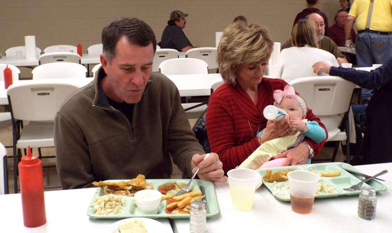 Larry Valier of Du Quoin gets down to the business of the fish fry while his wife, Lisa, makes sure their granddaughter, Carleigh, gets her dinner. Carleigh is almost 7 months old and is the daughter of Jessica and Josh Hamburger of Du Quoin. Photo by Chanda Green
