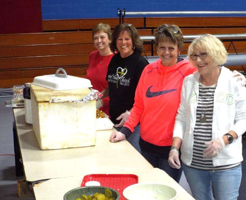 In a room behind the dining hall stand the carryout gals of Sacred Heart. Rose Alongi (from left), Debbie Mannino, Linda Eisenhauer and Mary Kunkel &#8211; all of Du Quoin &#8211; pack 'em, bag' em and pass 'em out with big smiles on their faces. Photo by Chanda Green