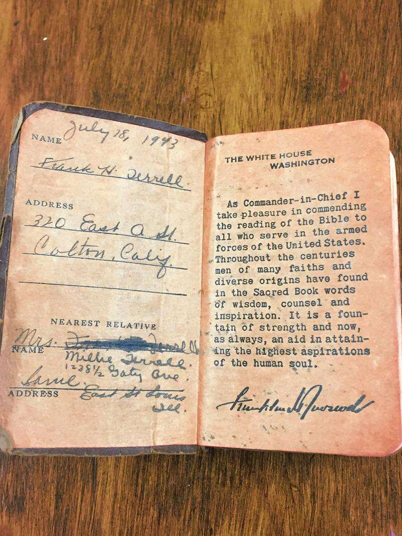 This particular Bible was issued to soldier Frank H. Terrell, born in Murphysboro. Today it belongs to an employee of the Gold Plate program of Perry County, an adult day care center in Du Quoin.