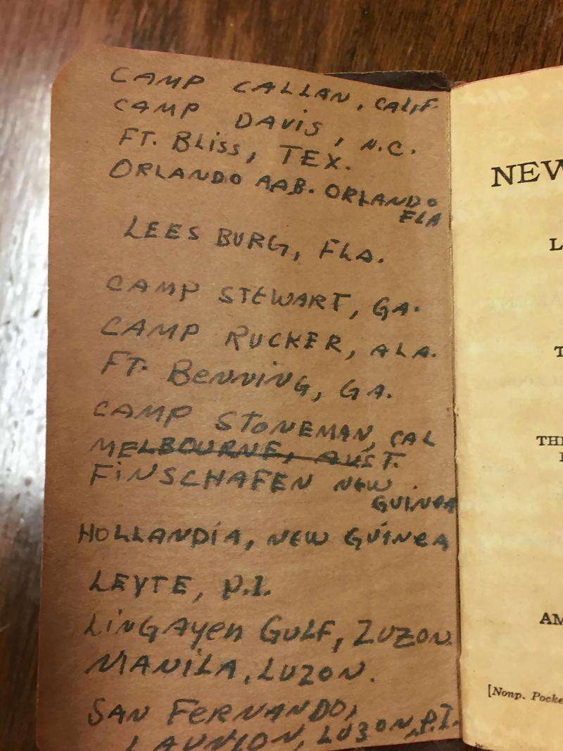 We know that Frank Terrell was given the Bible on July 18, 1943 and that like many soldiers, he kept a record of his movements on the third page.