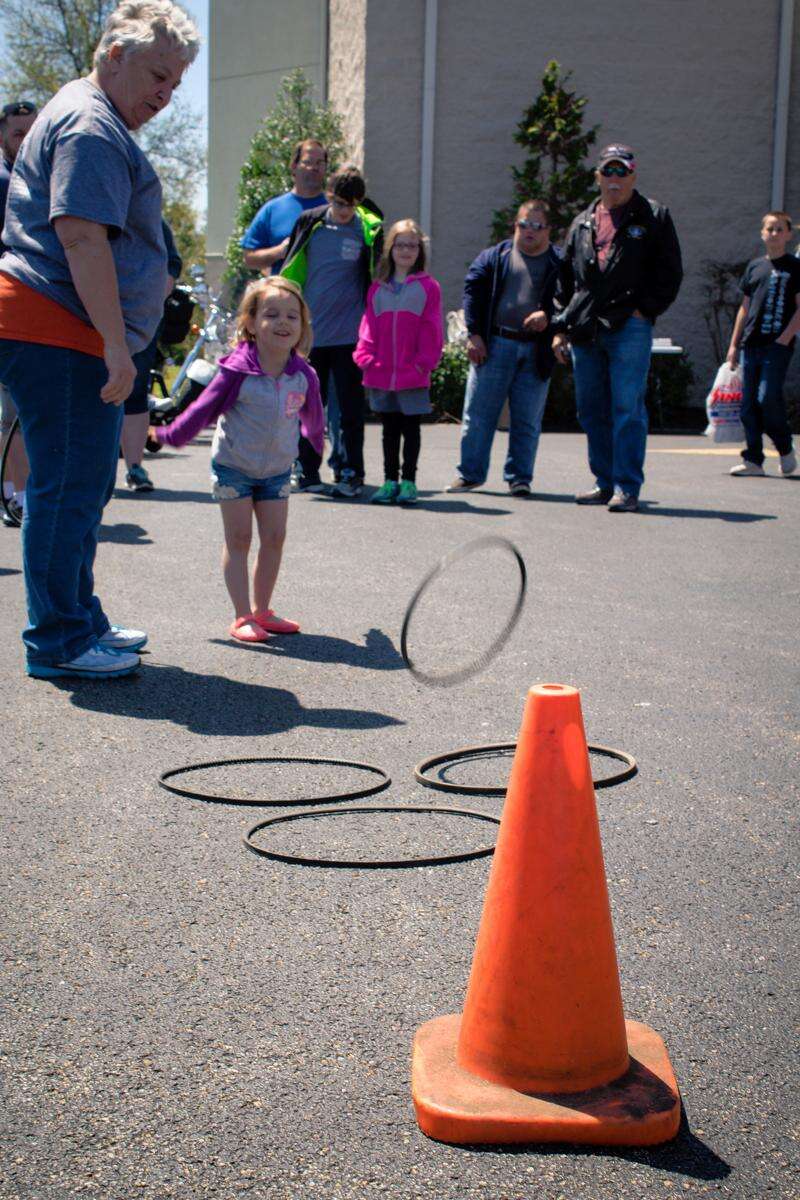 Jaylin Lewis, daughter of Joey Lewis of Herrin, takes a chance at one of many games offered Saturday afternoon at the 4th Annual S.I. Hot Rodders Car, Truck and Motorcycle Show in Herrin. Jaylin won a free ice cream cone from playing the 'Fan Belt Toss.'