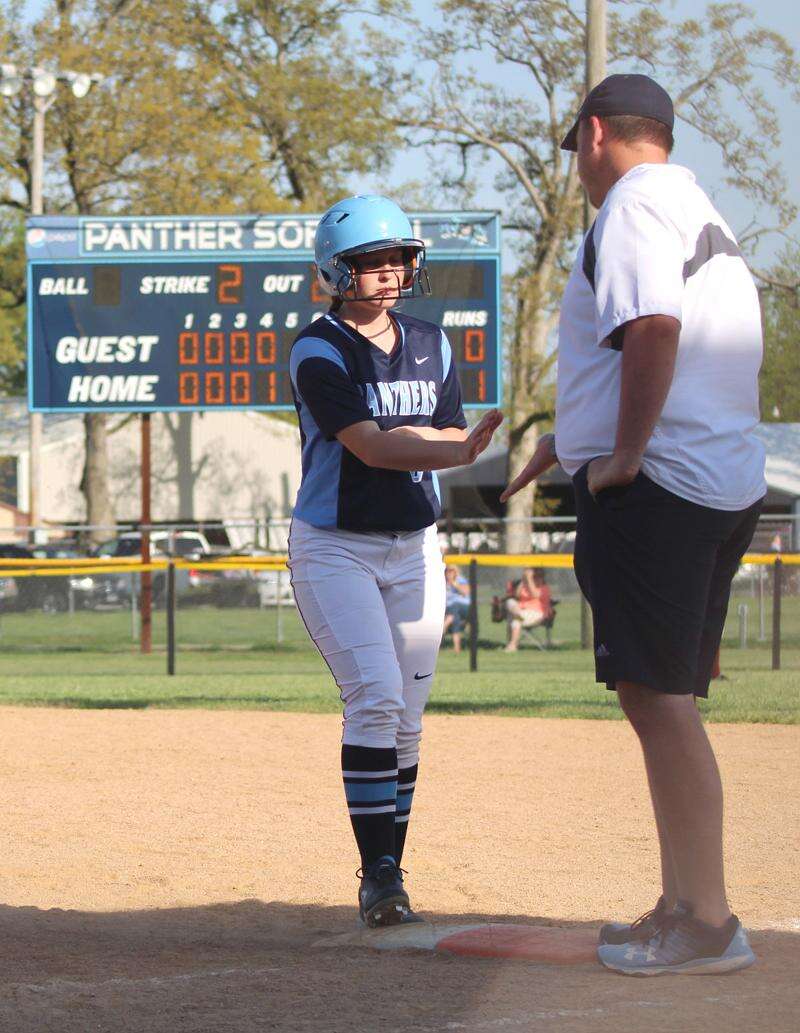 First base coach C.J. Opp congratulates Lynlee Lindner for her RBI single in the fourth inning.