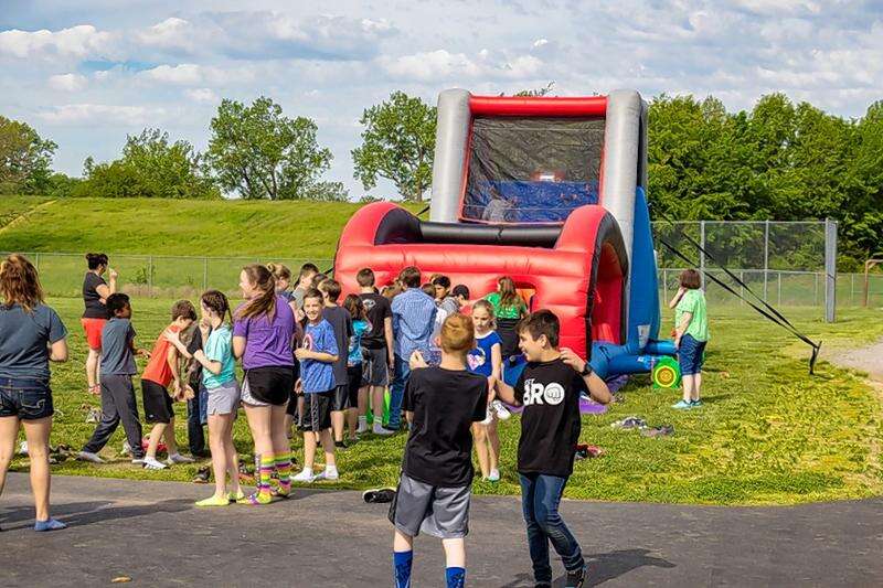 Du Quoin students gather around one of the inflatable games during PBIS Fun Day festivities.