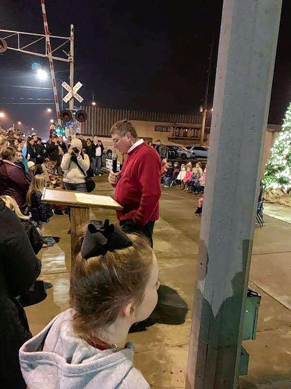 Mayor Guy Alongi addresses the crowd following the official lighting of the city's Christmas tree Thursday. State Rep. Terri Bryant was also present at the ceremony and addressed the gathering.