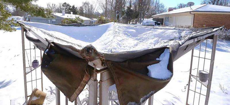 While most Southern Illinoisans will have survived this past weekend's snowstorm without serious damage to themselves and their property, there was the occasional casualty as a result of the snow event. The mixture of heavy, wet snow and some ice was just too much for this backyard gazebo's top structure to handle. The Marion homeowner said, "In past snowstorms, I've always managed to get outside and knock the bulk of the snow off the canvas top, but this year I wasn't able to and as a result, it looks like I'll be buying a new gazebo this spring."