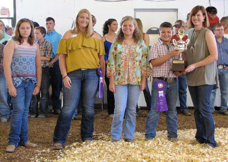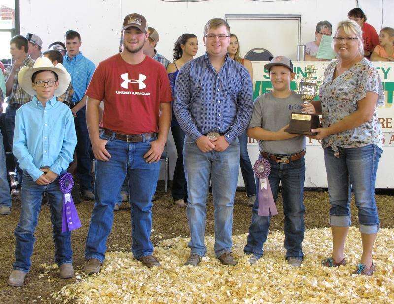 The Top 5 Daily Rate of Gain market swine owners, from left, are Karson Baird, Caleb Boulds, Ely Boulds and 2019 Swine Rate of Gain trophy sinner, Cayden Baird, pictured with Swine Superintendent Samantha Parish. Courtesy of Nancy Lambert
