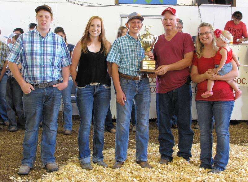 Top 5 Daily Rate of Gain market meat goat owners, from left, are Shelby Rann, Adrienne Poore, Courtney Boulds, and 2019 Meat Goat Rate of Gain trophy winner, Gavin Horton, pictured with Meat Goat Superintendent Rachel Parish. This is Gavin's fourth win in a row. Courtesy of Nancy Lambert