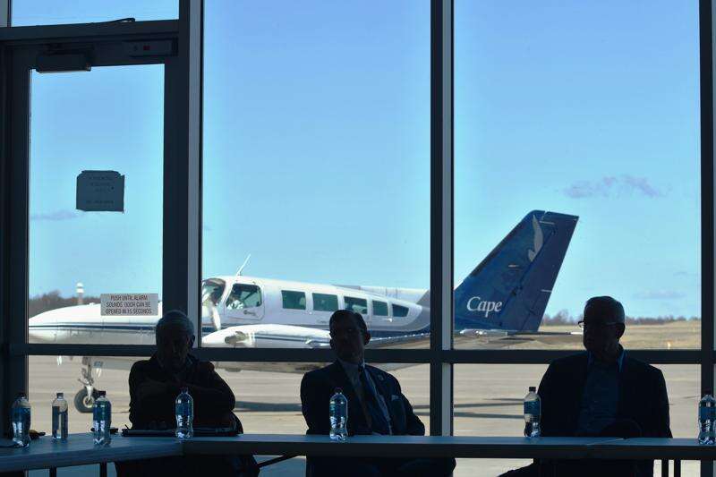 During a meeting to discuss a Chicago-to-Marion direct flight route at Veterans Airport Friday, a Cape Air plane taxis past the meeting room. TRAVIS DENEAL PHOTO