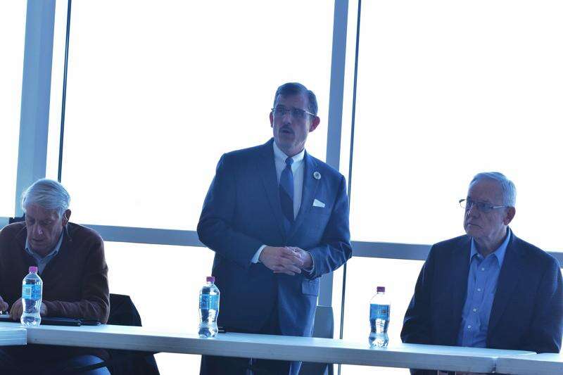 Marion Mayor Mike Absher, standing, discusses a proposal for a Chicago-to-Marion flight at a meeting at Veterans Airport. Carbondale Mayor Mike Henry, right, and Herrin Mayor Steve Frattini, left, have been working in conjunction with Absher to encourage the idea. TRAVIS DENEAL PHOTO