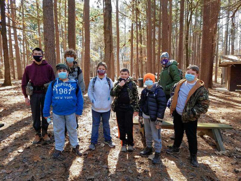 From left, Harrisburg Troop 23 B Scouts Justin Horn, Braden Hall, Justin Haney, Landon Bailey, Jordan Spanel, Peyton Daymon and Chance Lampley participated in the 50th Anniversary Klondike 2021 Adventure. Assistant Scoutmaster Chris Spanel, back right, supervised the troop. TRAVIS DENEAL PHOTO