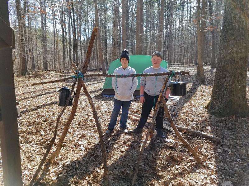 From left, Harrisburg Troop 23 B members Landon Bailey and Chance Lampley show off the camp gadget, a pot hanger, they helped build using lashings. Scouts Justin Haney and Justin Horn started the project but were unavailable for the photo. TRAVIS DENEAL PHOTO