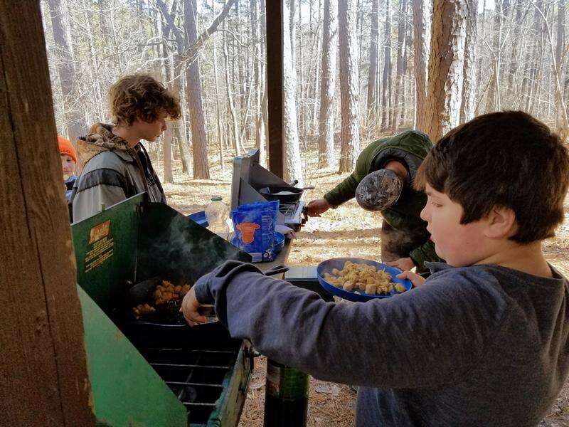Harrisburg Troop 23 B Scout Braden Hall spoons seasoned chicken onto a plate while Scout Justin Haney, left, observes Assistant Scoutmaster Chris Spanel teach cooking techniques. TRAVIS DENEAL PHOTO