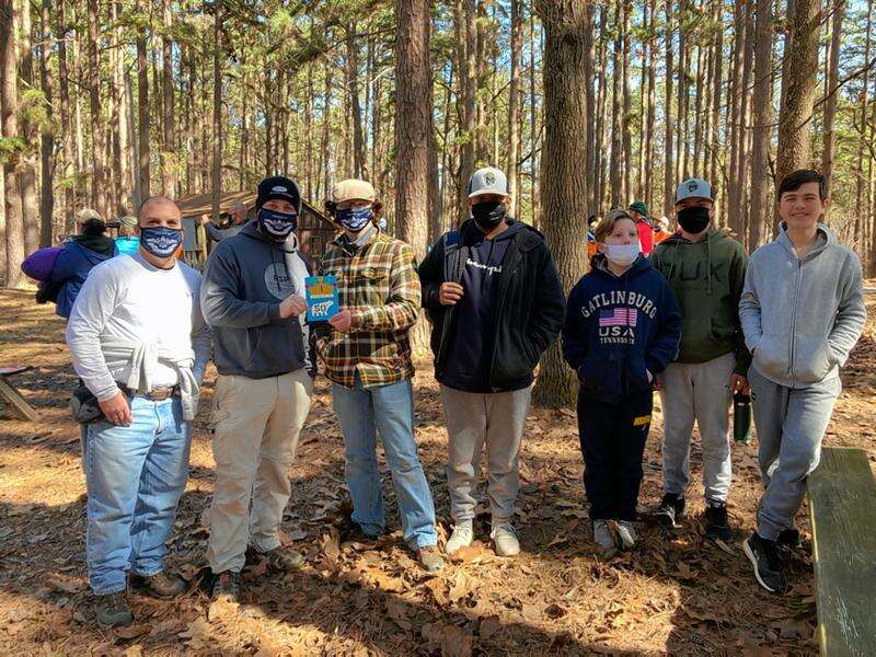 Members of Marion Troop 21 took top honors at the 50th Klondike Adventure 2021 over the weekend. From left are Scoutmaster Marc Henshaw, Cory Fuqua, Judah Pape, Leo Burnett, Kyler Henshaw, Dawson Burnett and Xander Fuqua. TRAVIS DENEAL PHOTO