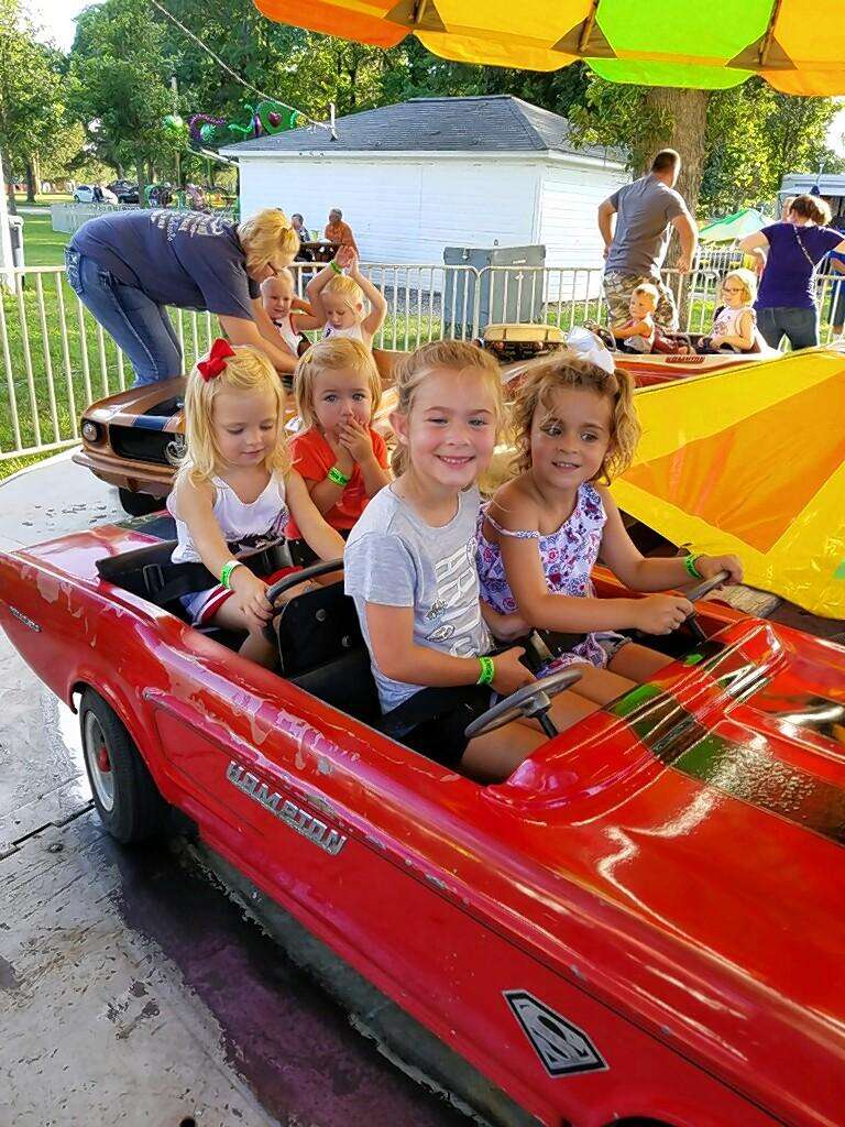 Harper Jany and Penelope Seymour, both 5 years old, take the front seat while Piper Seymour and Maren Jany, both 2 years old, ride in the back of the carnival ride at the Fourth of July picnic in Steeleville. All are from Chester. Gwendy Garner photo