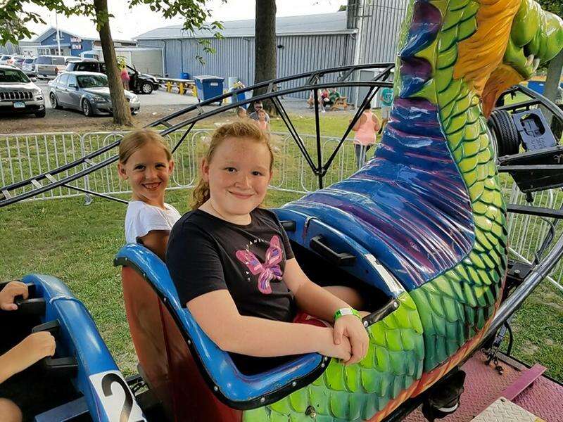 Left to right, 7-year-old Morgan Nanney and 9-year-old Kendall Nanney of Chester, prepare to ride the Dragon Wagon at the Fourth of July picnic in Steeleville.